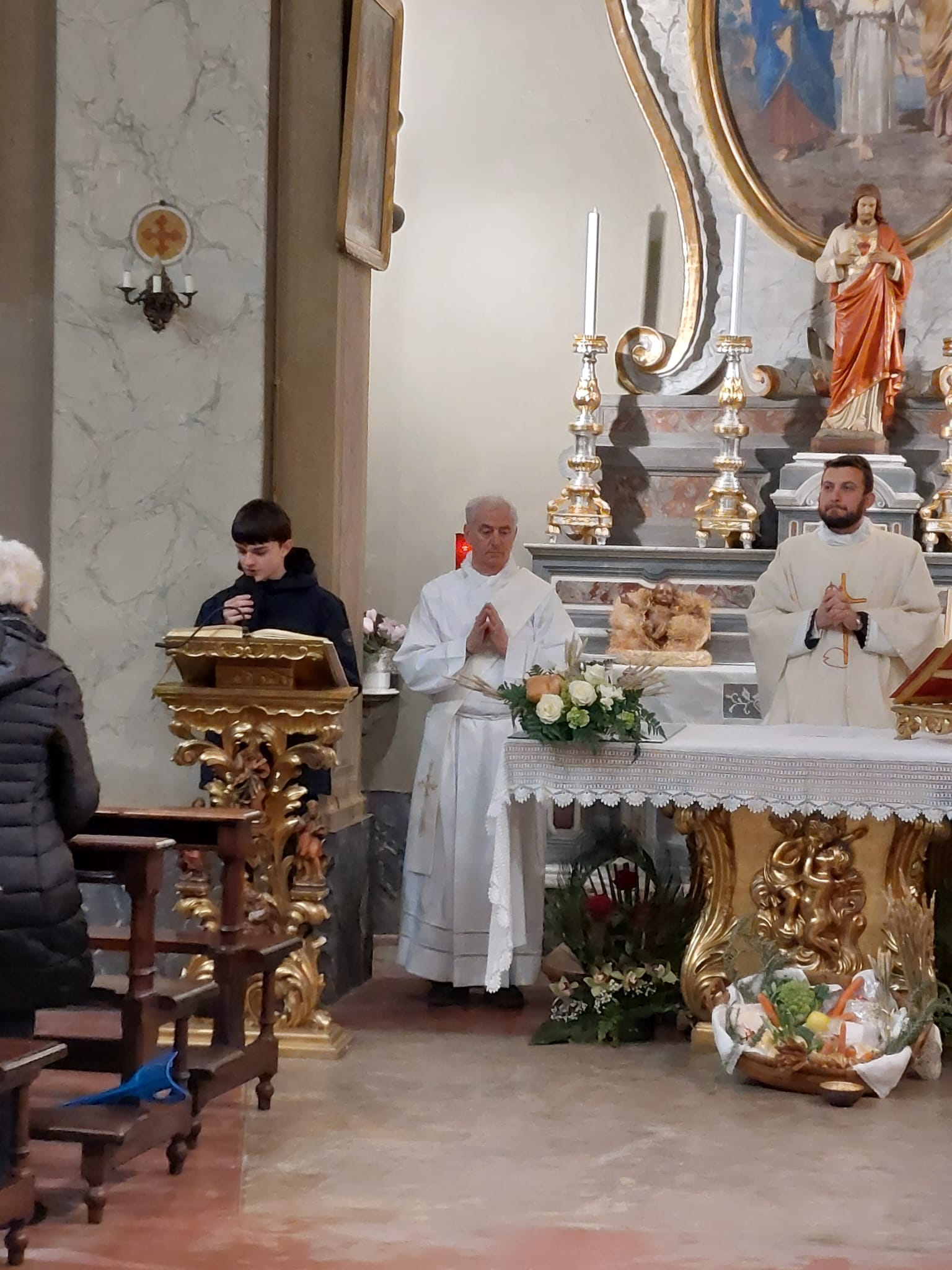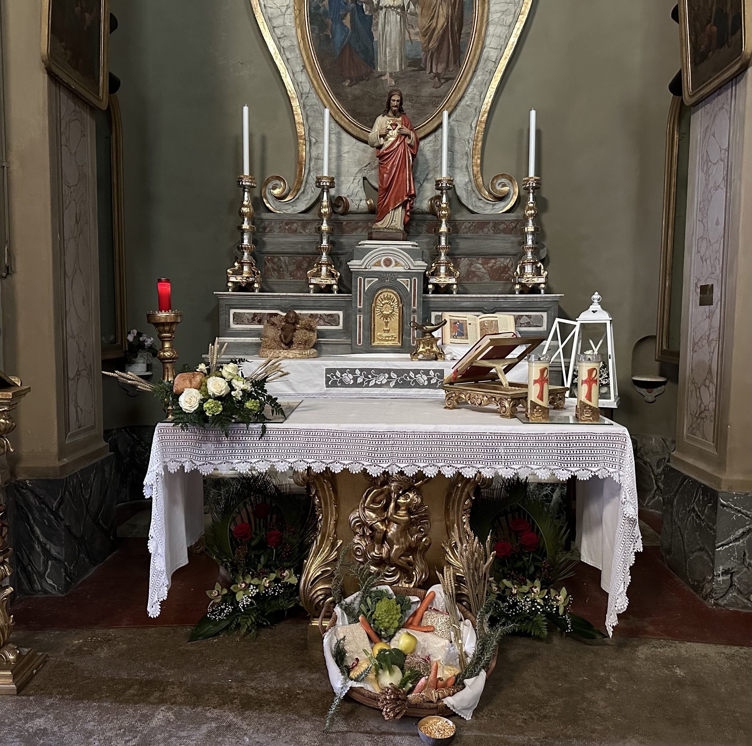 Per sottolineare la particolare forma di devozione e il ringraziamento, di consueto, in Chiesa parrocchiale, con la particolare cura che caratterizza la frazione, sempre attenta a mantenere decoro e sottolineare con gli allestimenti le celebrazioni liturgiche, situata davanti all’altare, il cesto delle primizie del suolo e della terra, in segno di offerta.