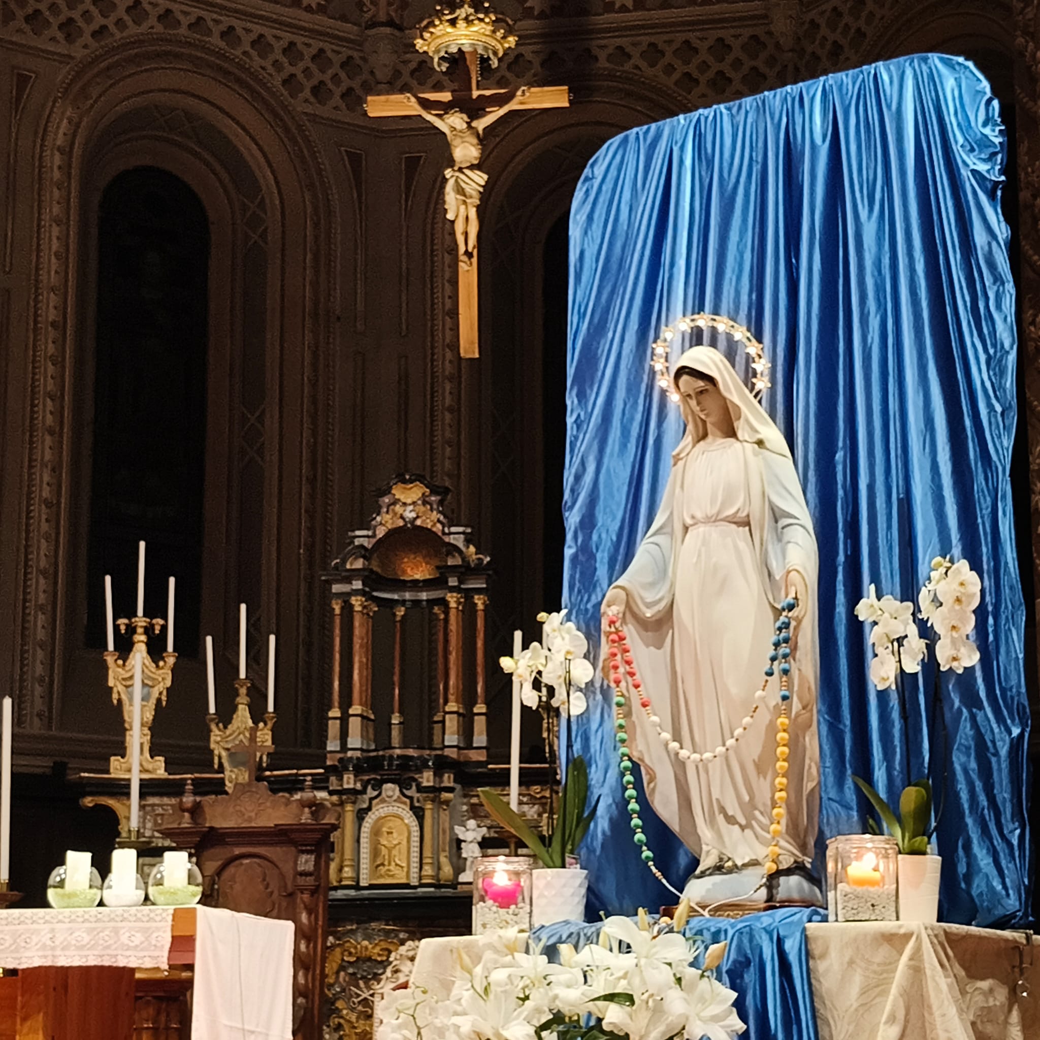 Tra le mani della Vergine è stata posta una corona dalle decine del S.Rosario, ognuna di colore diverso a rappresentare i cinque continenti che compongono il nostro Pianeta.
