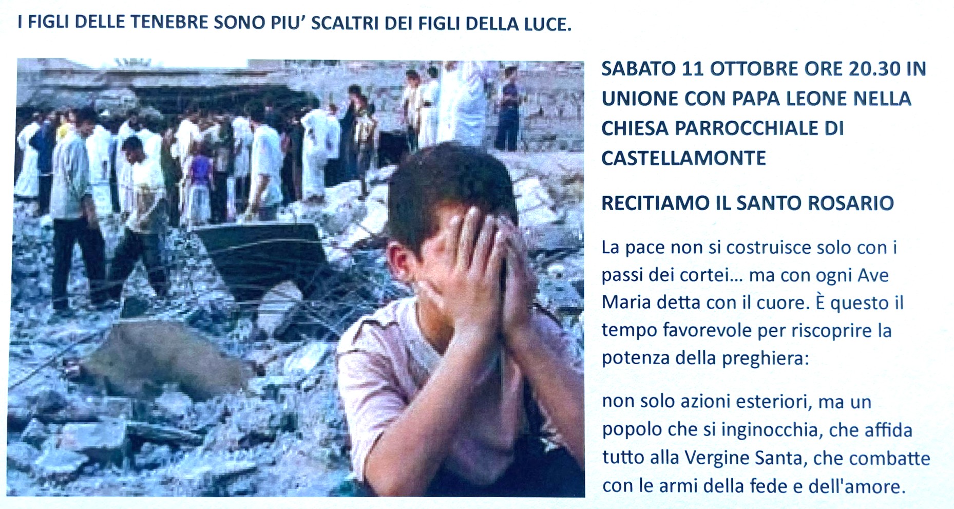 (giancarlo guidetti) – Molto profonda la riflessione che il parroco don Angelo Bianchi ci offre, e che ringraziamo, nel presentare la veglia di preghiera svoltasi – a Castellamonte come in tutta la Chiesa – sabato 11 ottobre, per impetrare la pace: dono di Dio affidato agli uomini.
