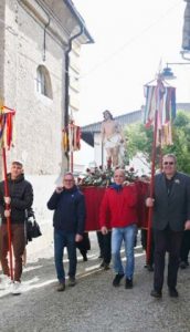 La statua del Santo allestita sulla portantina con splendidi decori è stata orgogliosamente portata dai rappresentanti del Gruppo Alpini e altri generosi compaesani lungo via Croce; a seguire la Cantoria, i priori e un folto gruppo di parrocchiani lo hanno festosamente accompagnato fino alla chiesa di San Victore per poi ridiscendere da via Roma e rientrare in chiesa.