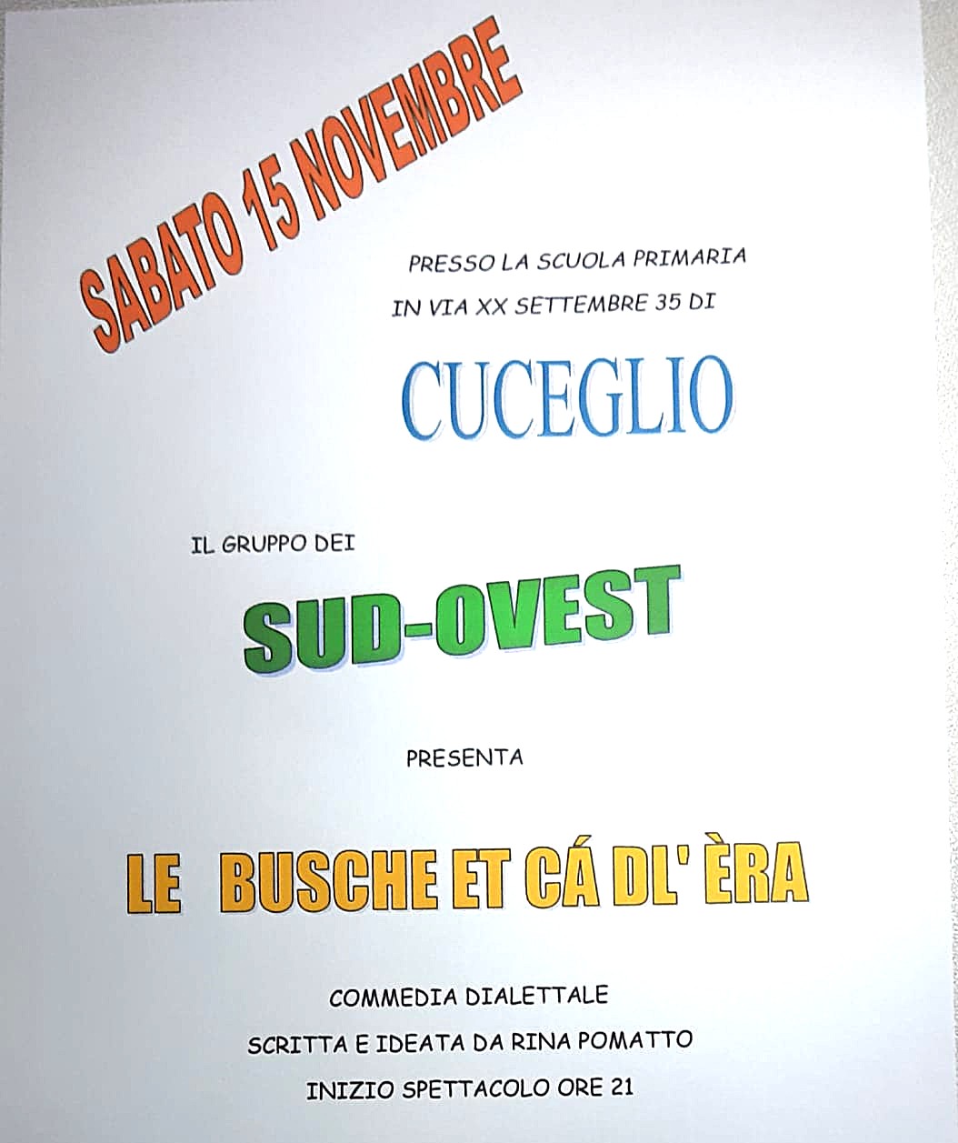 Mandata in scena dal “Gruppo dei Sud Ovest”, domani sera, 15 novembre, presso la Scuola Primaria di Via XX Settembre di Cuceglio, sarà rappresentata la commedia dialettale “Le busche et Cà d’èra”, divertente e sapida commedia dialettale ideata e scritta da Rina Pomatto.