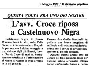 “Adesso riposa nel Canavese, a Castelnuovo Nigra. Dove era nato, dove aveva fatto il sindaco per tre legislature ininterrotte, dove conservava i suoi migliori amici (quelli di sempre, che si incontrano all’asilo, poi alle elementari, o i cacciatori del paese, oppure i compagni di tavolata), dove già sono sepolti tutti i suoi parenti. È stato tumulato nella tomba di famiglia, nel piccolo cimitero di provincia speronato sulla collina, il verde tutt’attorno e fiori spontanei che punteggiano campi e prati” (Gazzetta del popolo, 1° maggio 1977, p. 6).