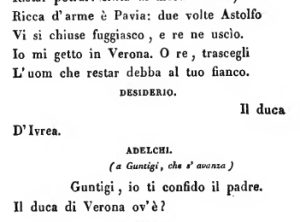 Sia nelle Notizie storiche sia nel Discorso il narratore argomenta la bontà di tale notizia, su cui si basa a tutti gli effetti l’azione del III e del IV Atto della tragedia. Ed è appunto il Duca di Ivrea, Guntigi, il principale responsabile del tradimento, o meglio della mancata “fedeltà” a Desiderio.