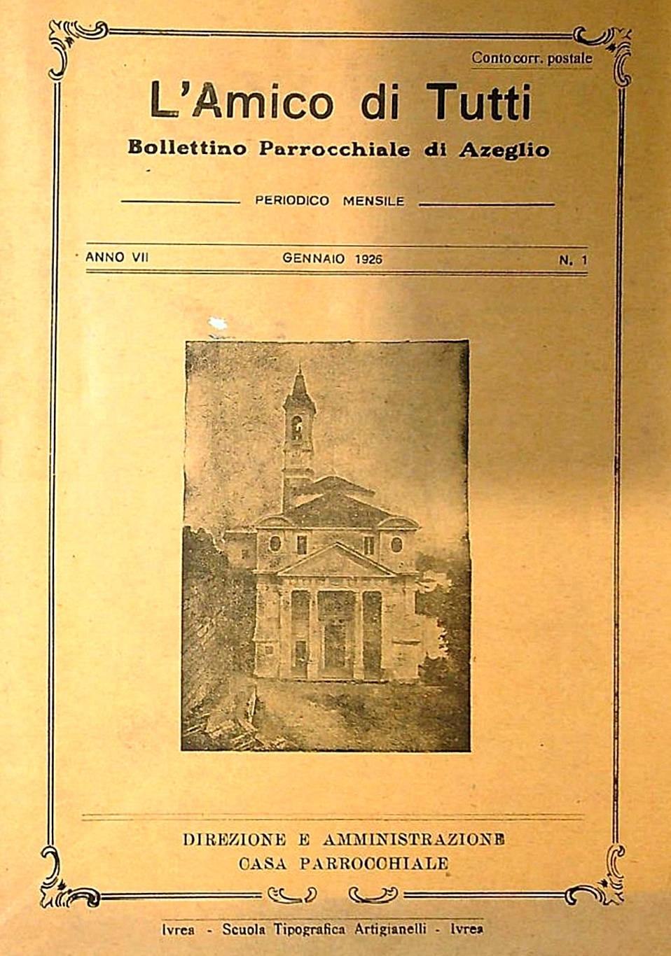 Il bollettino parrocchiale di Azeglio “L’Amico di tutti” fu un periodico mensile che iniziò la sua vita nel 1919 anche per dare conforto alle famiglie che avevano avuto lutti della Prima Guerra Mondiale conclusasi il 4 novembre 1918. Divenne così un prezioso foglio d’informazione per la comunità, all’epoca il paese contava poco più di 2.000 persone, oggi poco oltre le 1.200 unità. Esamineremo il numero di cento anni fa, quello del gennaio 1926.