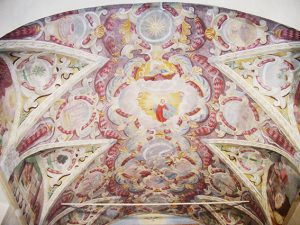 Strano per un pittore di notevole caratura. Se, appena entrati in chiesa, diamo uno sguardo alla volta a botte lunettata che ricopre le tre campate della navata, vediamo come essa ospiti una pluralità di figure e di scene di carattere sacro che s’inseriscono in una ricercata ed intrigante trama di ghirlande, volute in finto stucco e racemi; i sottarchi delle tre campate sono popolati da elementi decorativi a grottesche e da fantasiose geometrie composte da un fitto intreccio di stemmi, mascheroni, conchiglie, piccoli scorci paesaggistici, putti in monocromo ed altro ancora.
