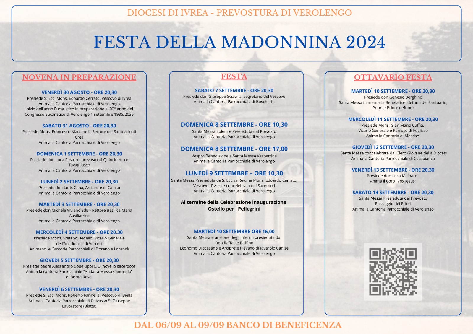 Proprio in occasione della festa, come da consuetudine consolidata del predecessore, don Giuseppe Boero, anche l’ attuale cappellano ed anche parroco di Verolengo e Borgo Revel, ha condiviso la preghiera della novena e l’animazione della Santa Messa, con diverse parrocchie limitrofe al Santuario.