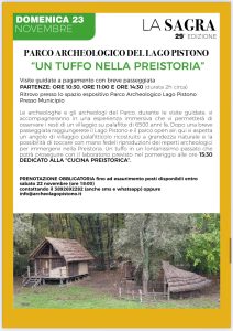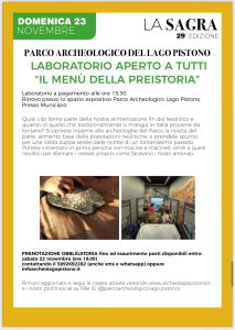 Domenica 23 sarà anche possibile visitare il parco archeologico del Lago Pistono, immerso tra colline, boschi e vigneti, prenotando al numero 389-2692282 o all’indirizzo e-mail info@archeolagopistono.it Un laboratorio pomeridiano a pagamento sarà dedicato al menù della preistoria.