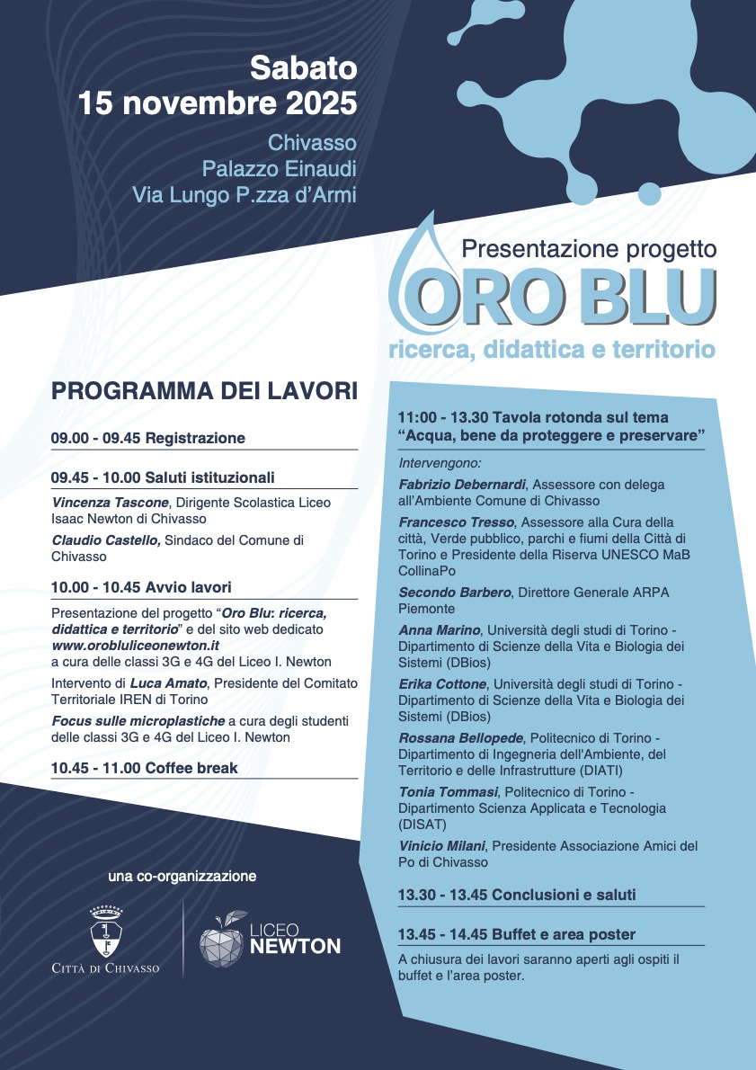 L’evento, co-organizzato dal Liceo Isaac Newton di Chivasso e dal Comune di Chivasso, rappresenta il coronamento di due anni di lavoro e ricerca. Durante la mattinata verranno infatti presentati i risultati di quattro progetti scientifici realizzati negli anni scolastici 2023-2024 e 2024-2025, frutto di una rete di collaborazioni di eccellenza che include l’Università di Torino, il Politecnico di Torino, Centro Alpstream, Legambiente, IREN, SETA S.p.A., il Laboratorio Chimico della Camera di Commercio di Torino, l’Associazione “Amici del Po” e la Cooperativa Sociale “Arcobaleno”.