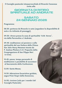 Un momento particolarmente importante sarà il ritiro spirituale di sabato 24 gennaio ad Andrate, rivolto a tutti gli operatori pastorali, con la guida di Padre Andrea Plichero dell’Oratorio San Filippo Neri di Ivrea.