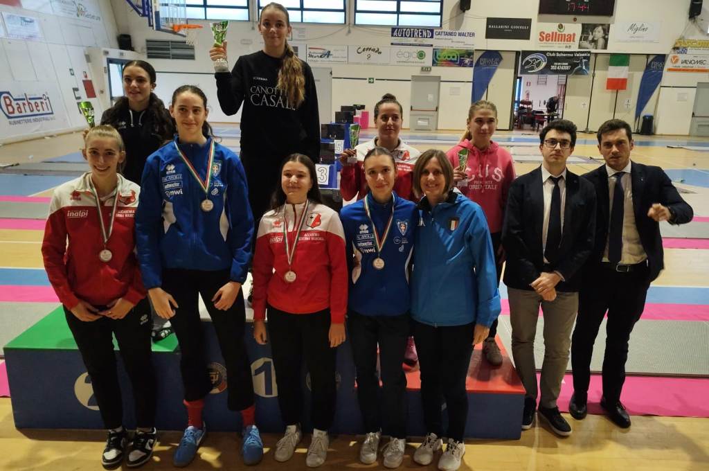 Nella gara femminile primo posto per Margherita Raiteri della Canottieri Casale, seconda Matilde Bellino dell’Associazione Scherma Pro Vercelli, terze Mariafernanda Bardascino dell’Accademia Scherma Marchesa Torino e Giorgia Gallo del Cus Piemonte Orientale.