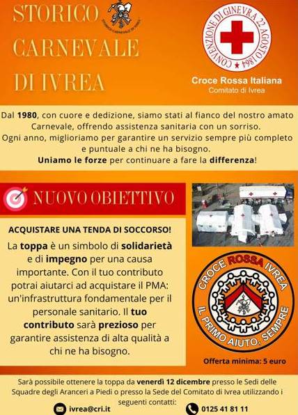 La Fondazione dello Storico Carnevale di Ivrea ha avviato una importante collaborazione con la Croce Rossa Italiana – Comitato di Ivrea con l’obiettivo di sostenere l’acquisto di una tenda P.M.A. – Posto Medico Avanzato.